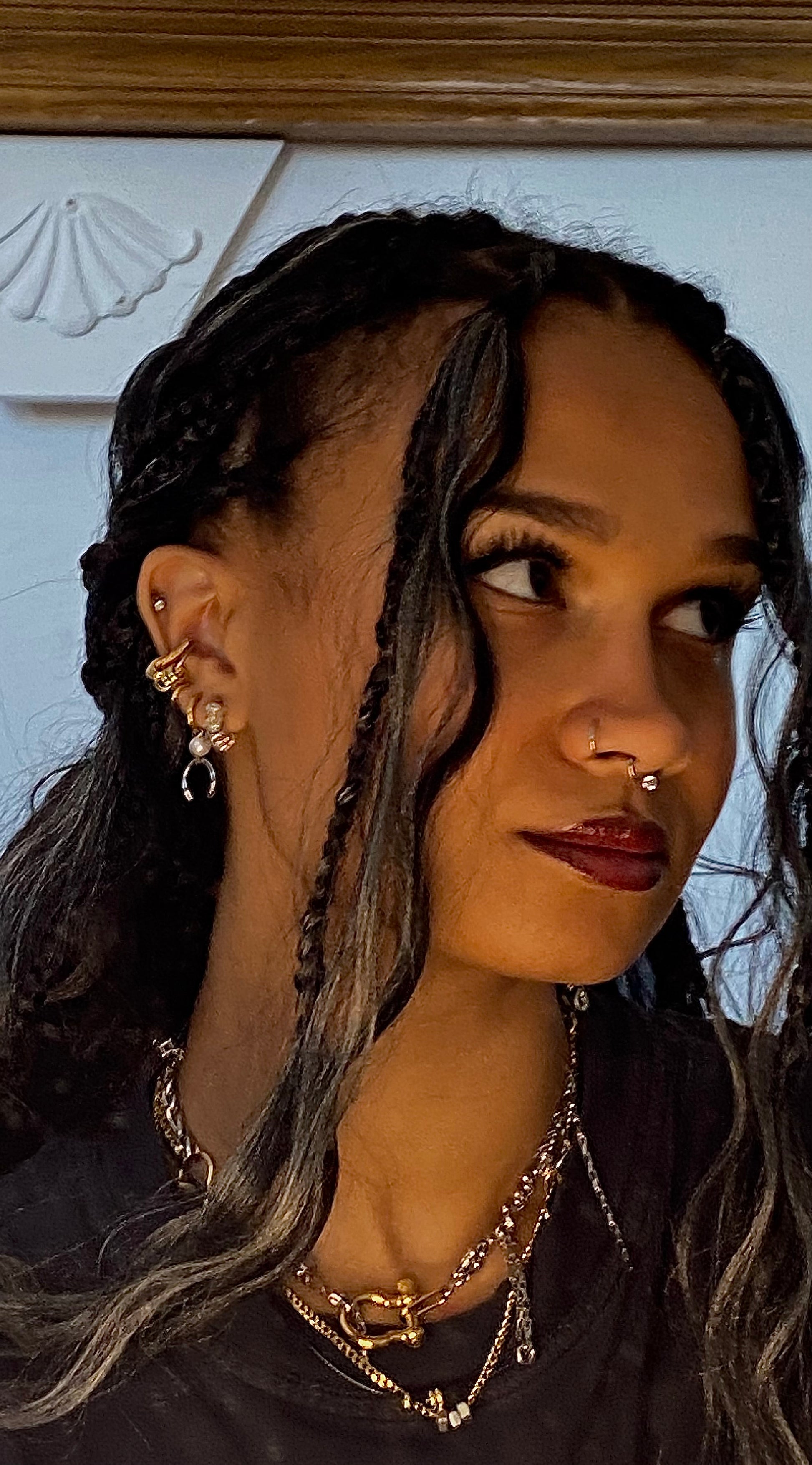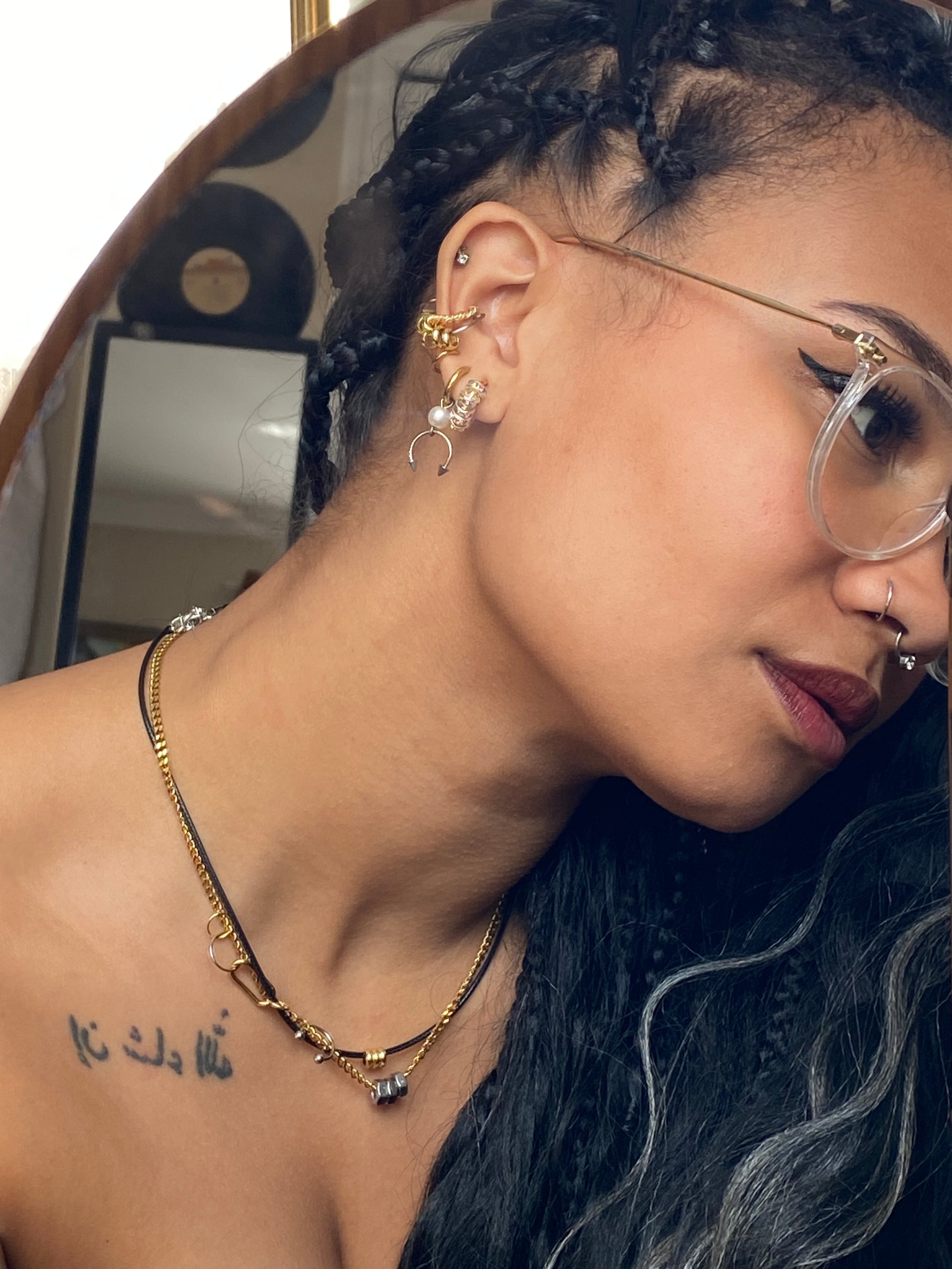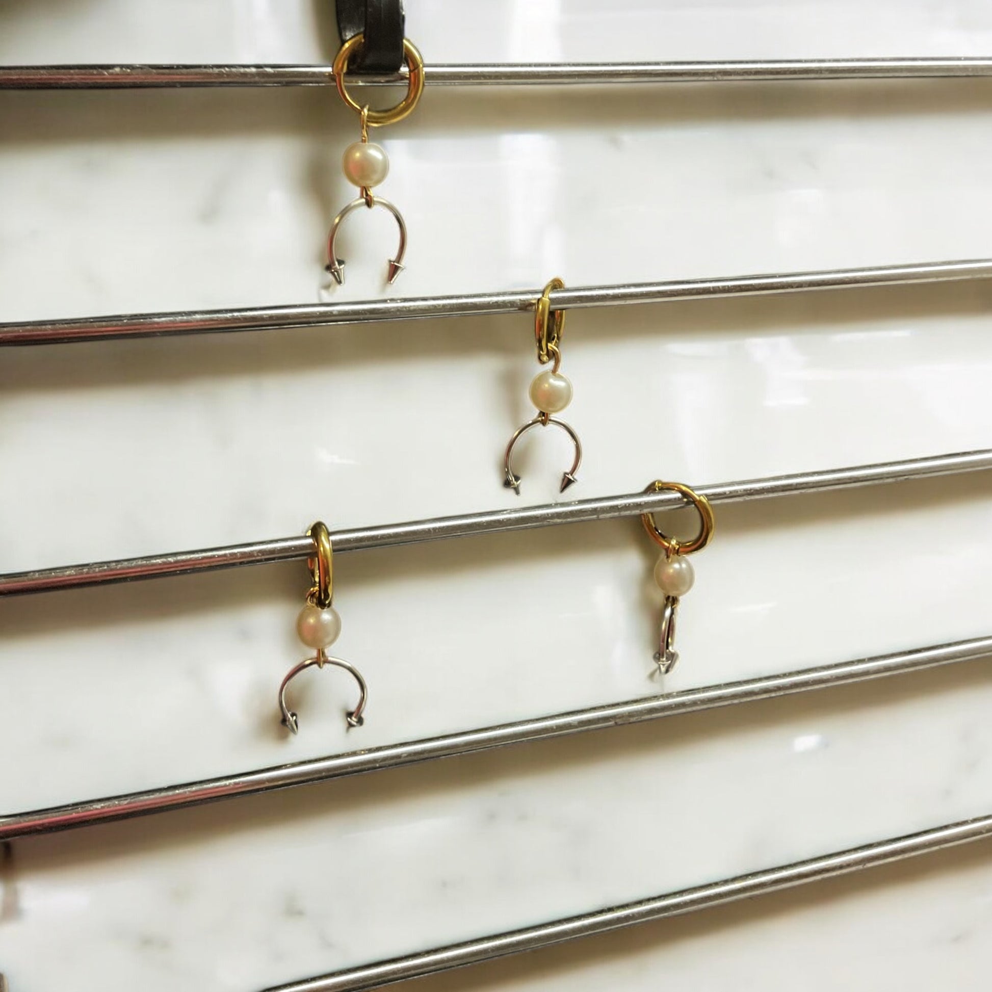 l'asymétrie est à l'honneur — faites-en votre propre mouvement. la boucle d'oreille 1311 est une question de contraste — une perle lisse rencontre un croissant à pointe de flèche, suspendu à un anneau plaqué or. le détail en métal mixte provient de l'élément de perçage en acier inoxydable, ajoutant juste la bonne quantité de bord.