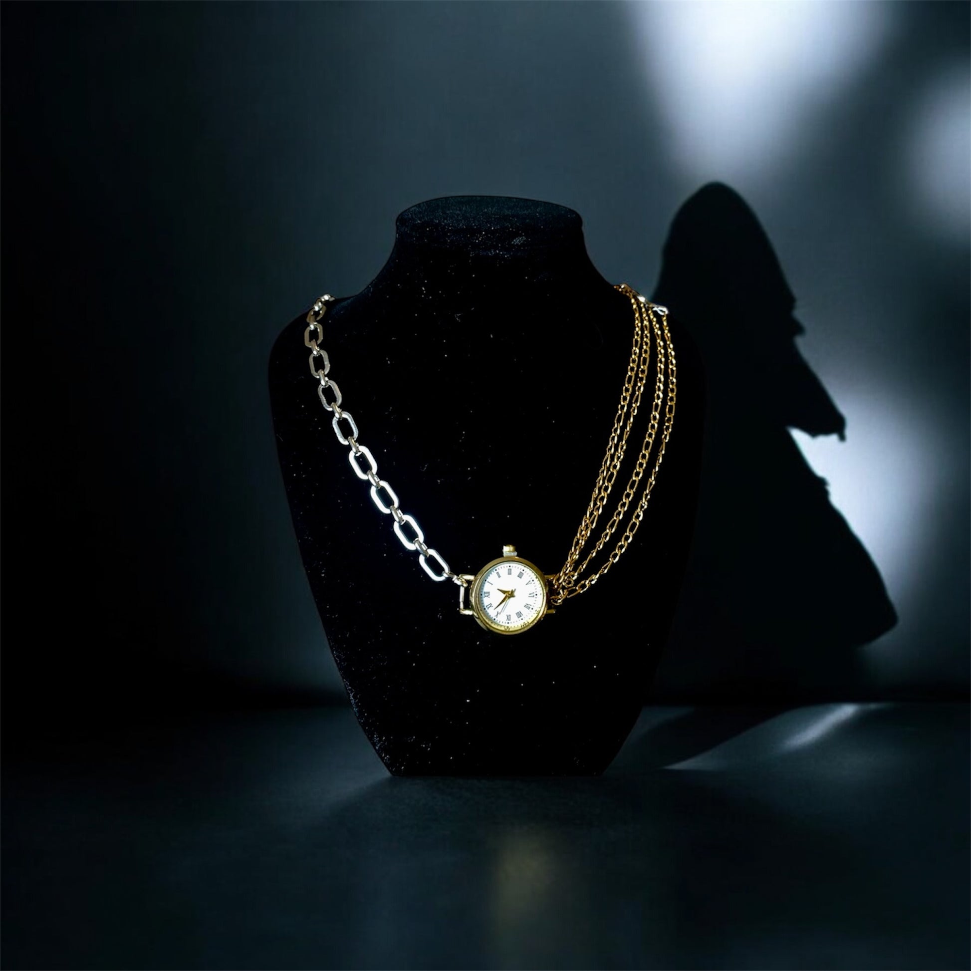 le temps ne vous poursuit pas, vous le portez. le collier clocked in est à la fois une relique et une rébellion. une véritable montre à tic-tac ancre la pièce, suspendue entre d'épais maillons en argent et des chaînes en or. pour ceux qui pointent selon leurs propres conditions.