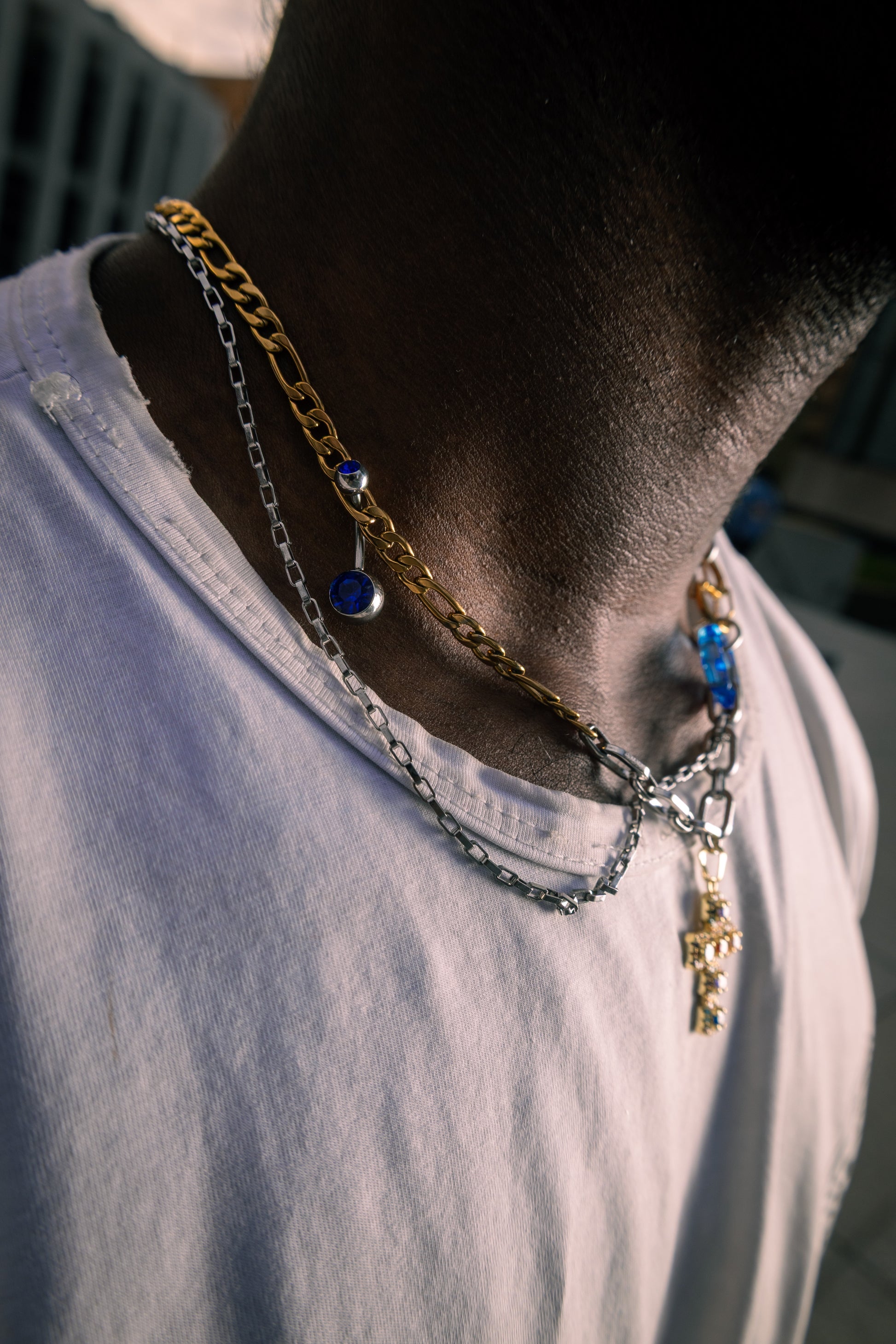 grâce avec courage. le collier pardonné présente des chaînes asymétriques en acier inoxydable doré et argenté, accentuées de détails bleu saphir, d'un maillon en résine translucide et d'un pendentif en croix en strass multicolore. indéniablement audacieux — cette pièce unisexe est imperméable, ne ternit pas et est fabriquée à la main au québec.