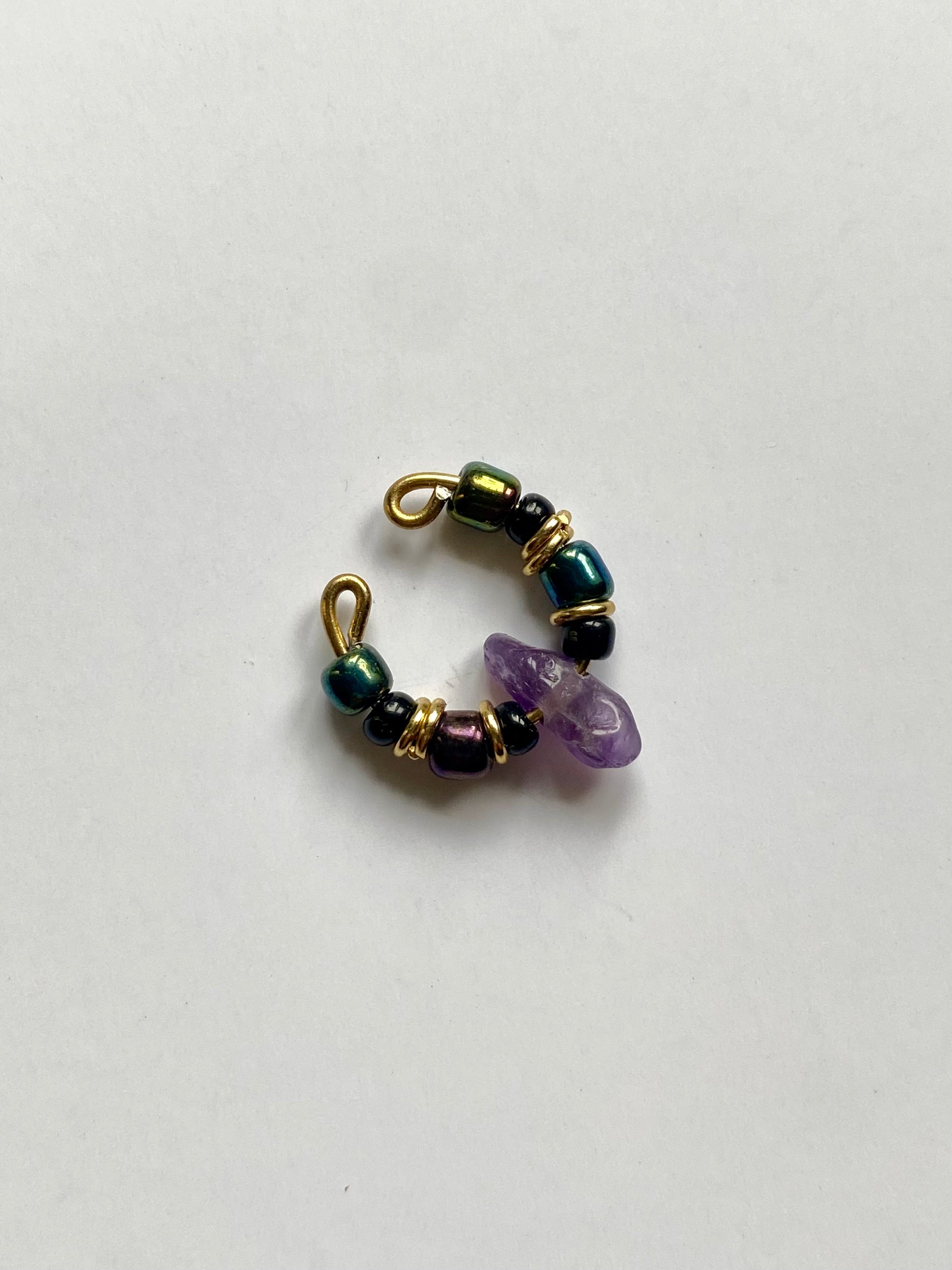 aucun perçage requis. le earcuff intuition mélange des perles irisées profondes avec des accents noirs et dorés, ancrés par une pierre d'améthyste taillée brute - connue pour son énergie apaisante et intuitive. une pièce audacieuse avec des vibrations ancrées.