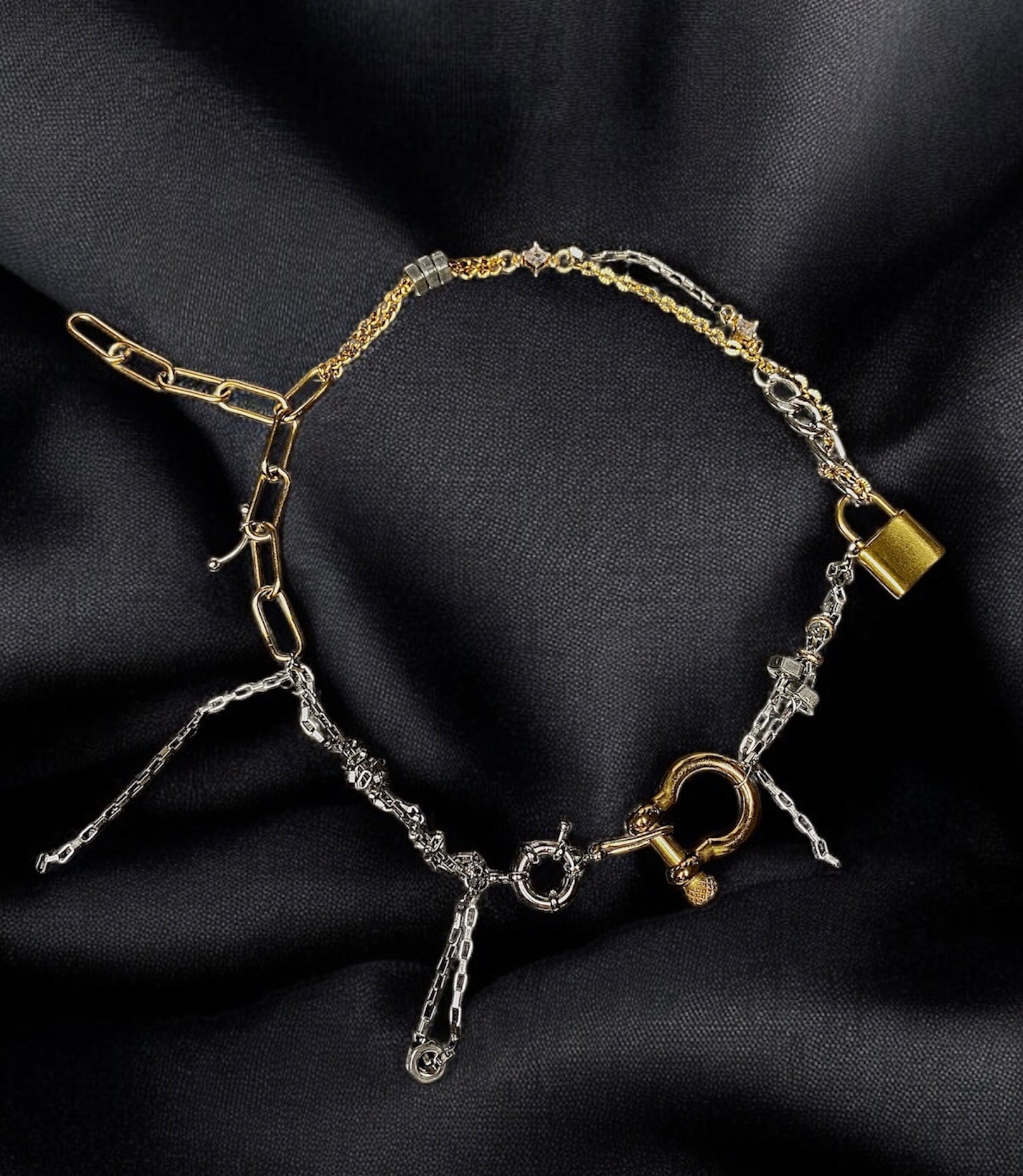 Le collier Sam is Alive and Well réinvente le passé, assemblant des fragments épars pour créer quelque chose de brut, indompté et vibrant. Un mélange audacieux d’or et d’argent, des maillons industriels, des détails inspirés des piercings et des chaînes complexes—un désordre parfaitement intentionnel.