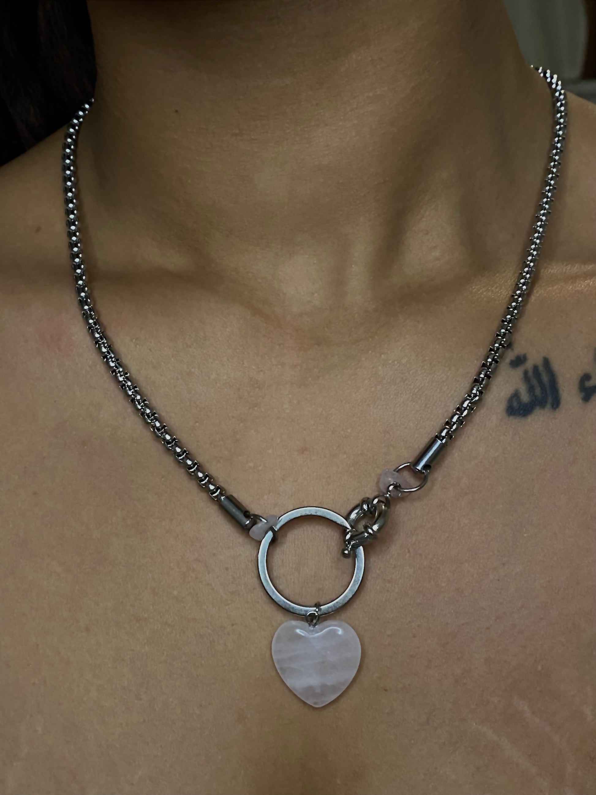 Matériaux : Acier inoxydable, pendentif en quartz rose en forme de coeur
