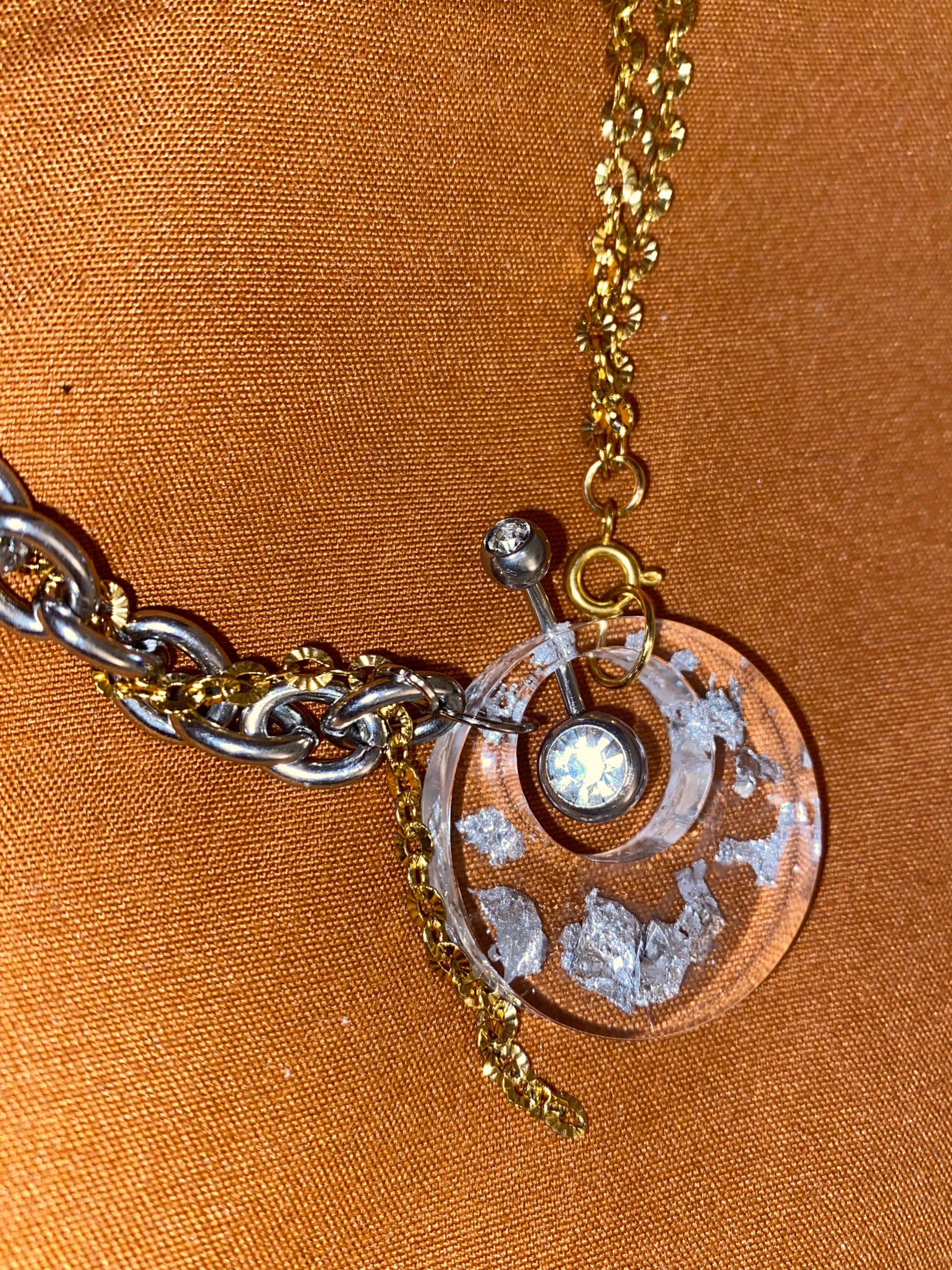 Le collier Unchained, c’est la liberté capturée dans la résine. Des fragments de feuille d’argent suspendus dans un médaillon, comme une promesse d’évasion, figée dans le temps. Brut, organique, sans attaches—sauf celles que tu choisis.