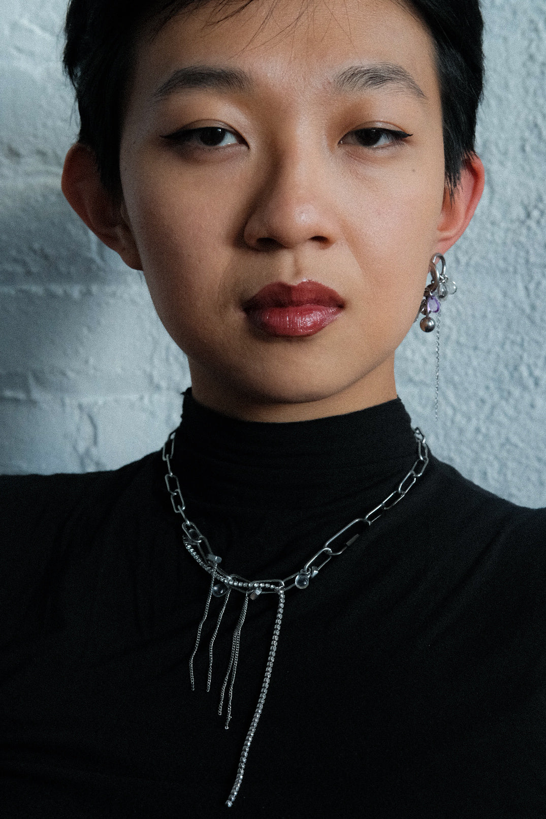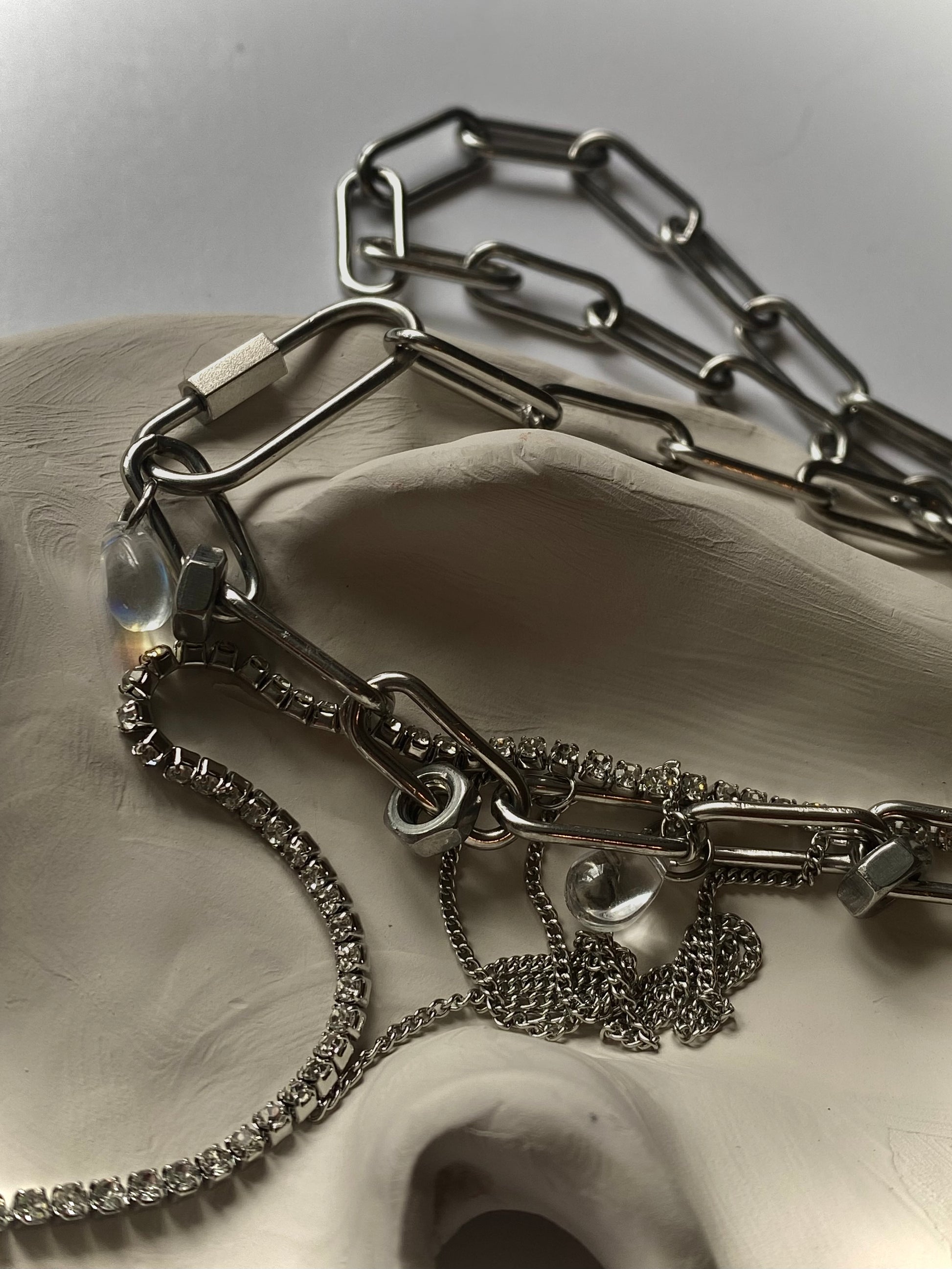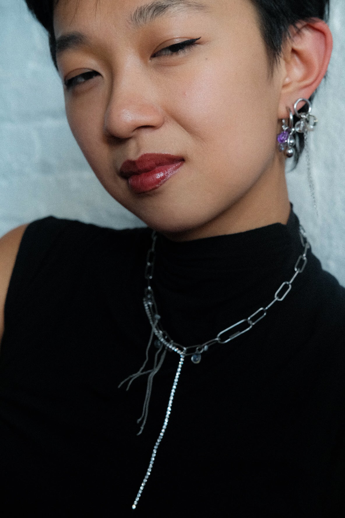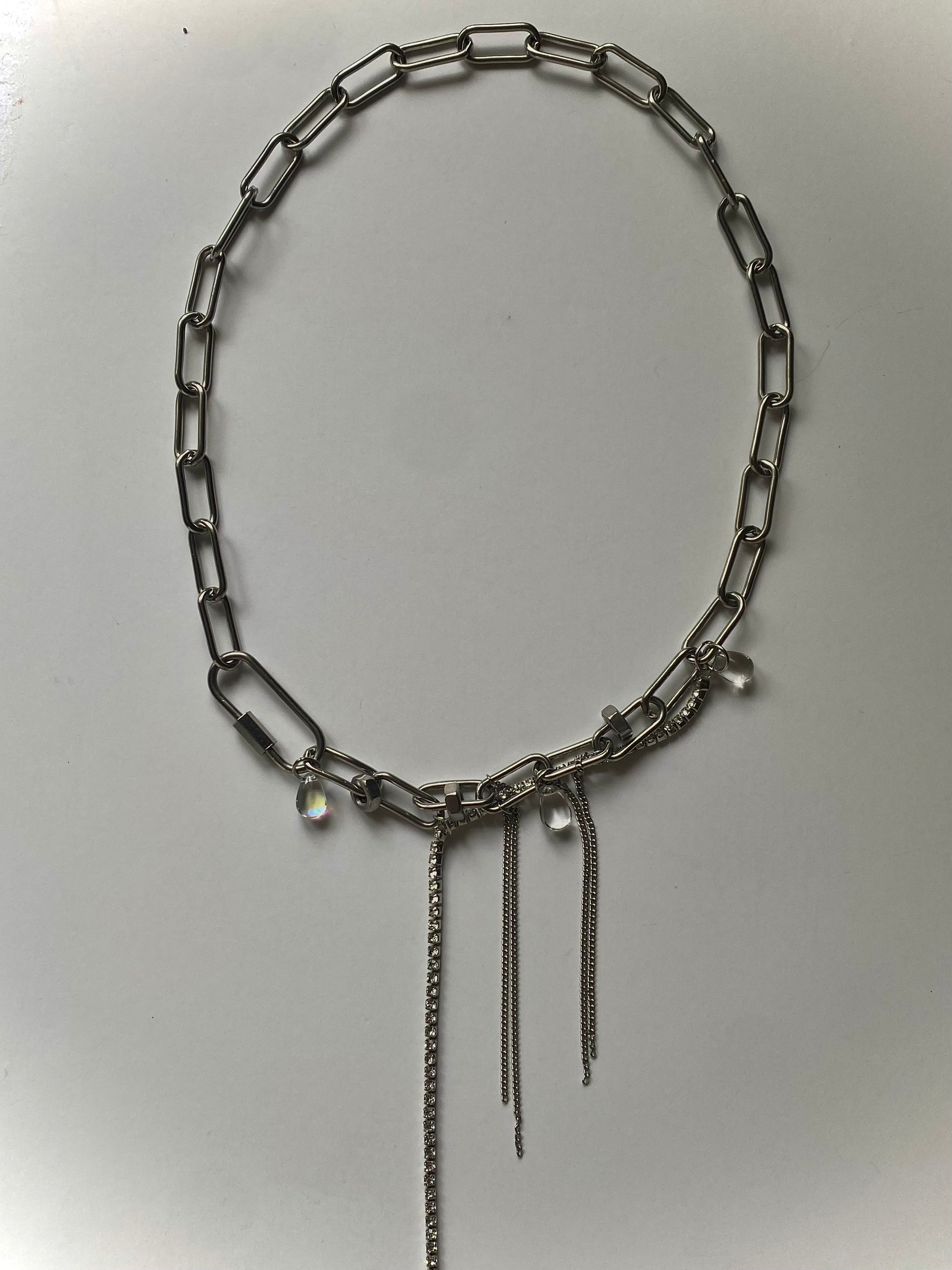 • Accents : Charms goutte transparents, mousqueton en acier inoxydable, détail en chaîne strass, fines chaînes superposées