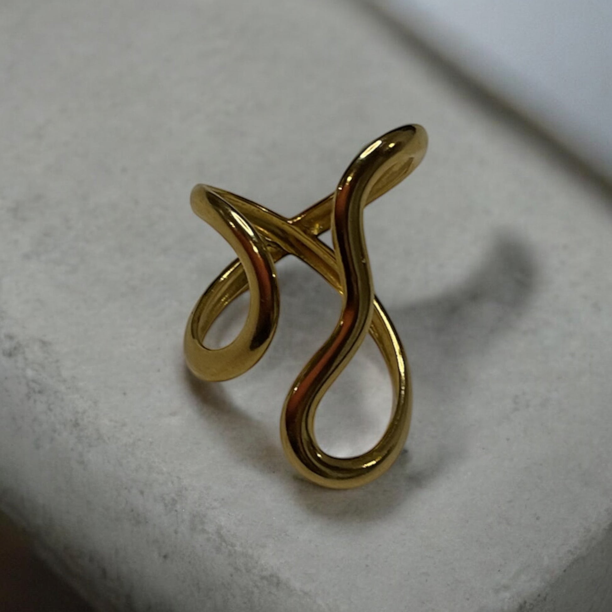 The Deep ring flows like liquid metals—smooth, bold, and impossible to ignore. Its open, intertwined design plays with space, giving it a sculptural feel that shifts with every movement. Gold-plated and adjustable, it’s made to fit you.