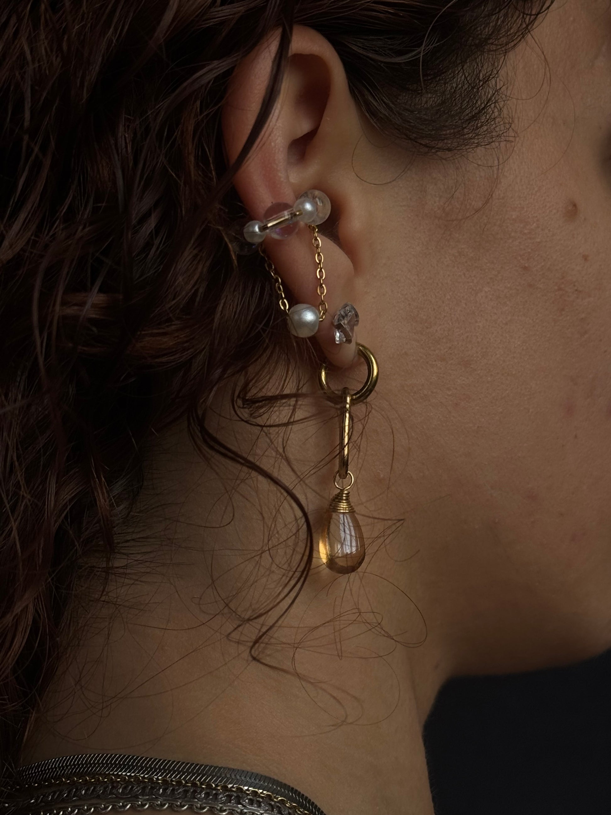 no piercing needed. the rayouna earcuff features clear and pearl-like beads anchored by a golden chain detail that adds softness and shimmer. light-catching and elegant with a subtle twist.