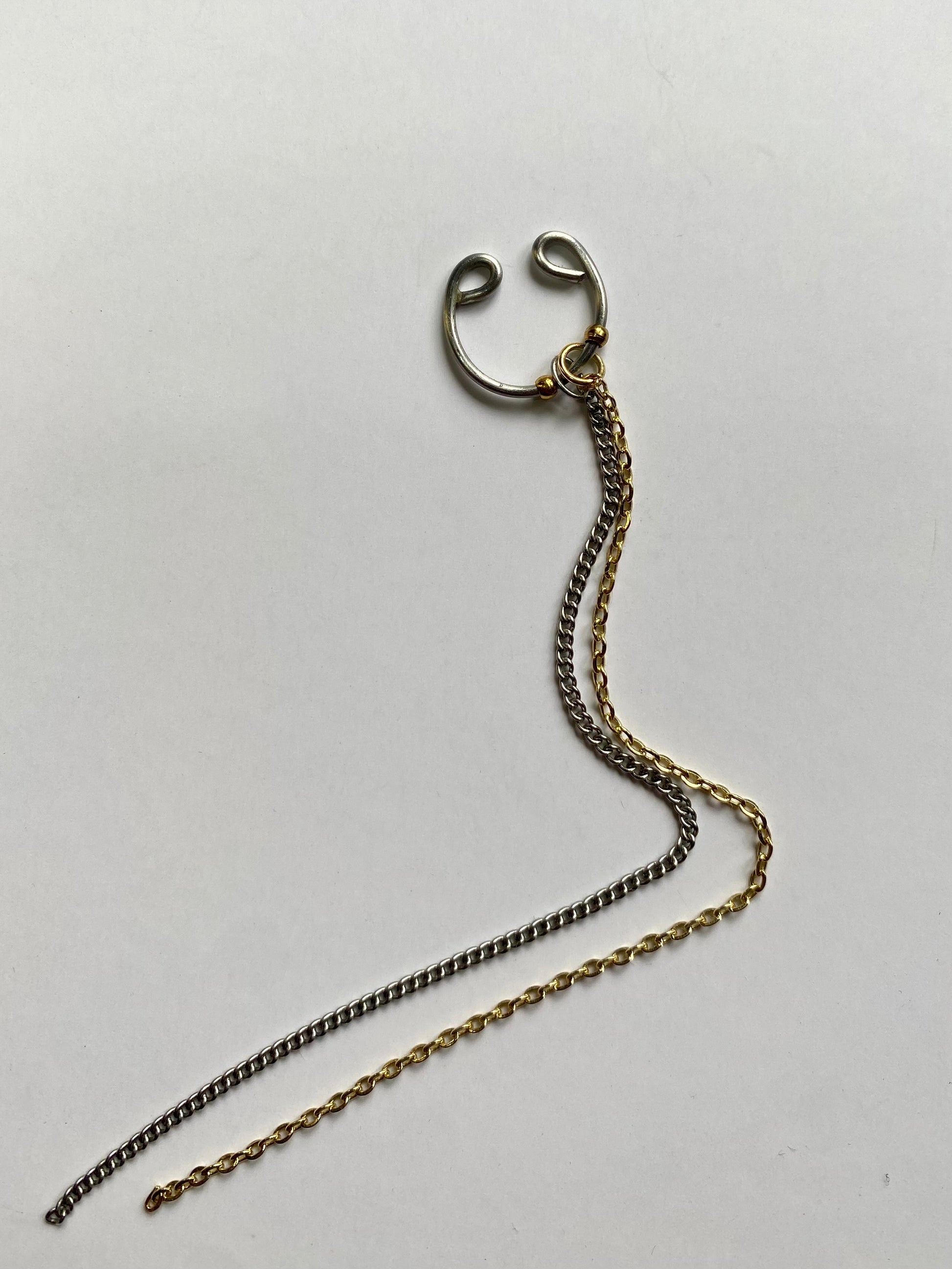 no piercing needed. the scorpio features a sleek silver earcuff with dual hanging chains — one in gold, one in silver — for a bold, minimal look with contrast and fluidity. clean lines, sharp balance, and effortless impact.