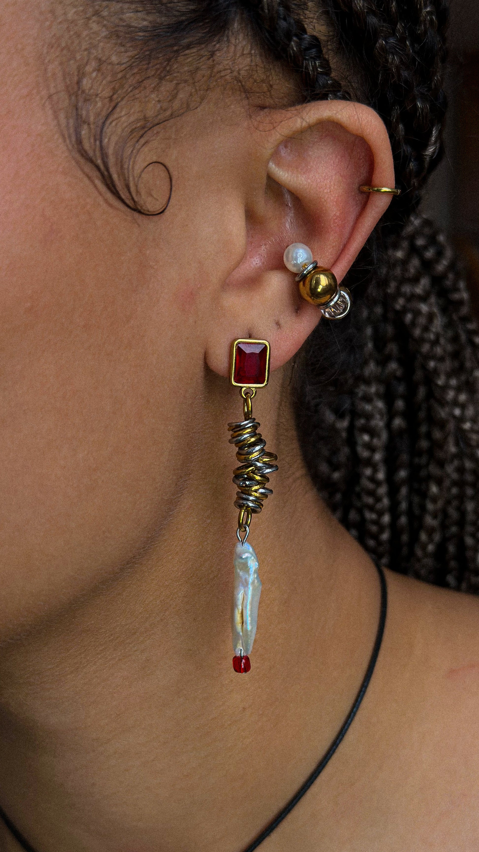 Soulmate is a unique mono-earring combining a bold red stud, coiled metal texture, and a freshwater pearl drop. Its mix of elegance and soft organic shape gives it a clean but striking contrast.