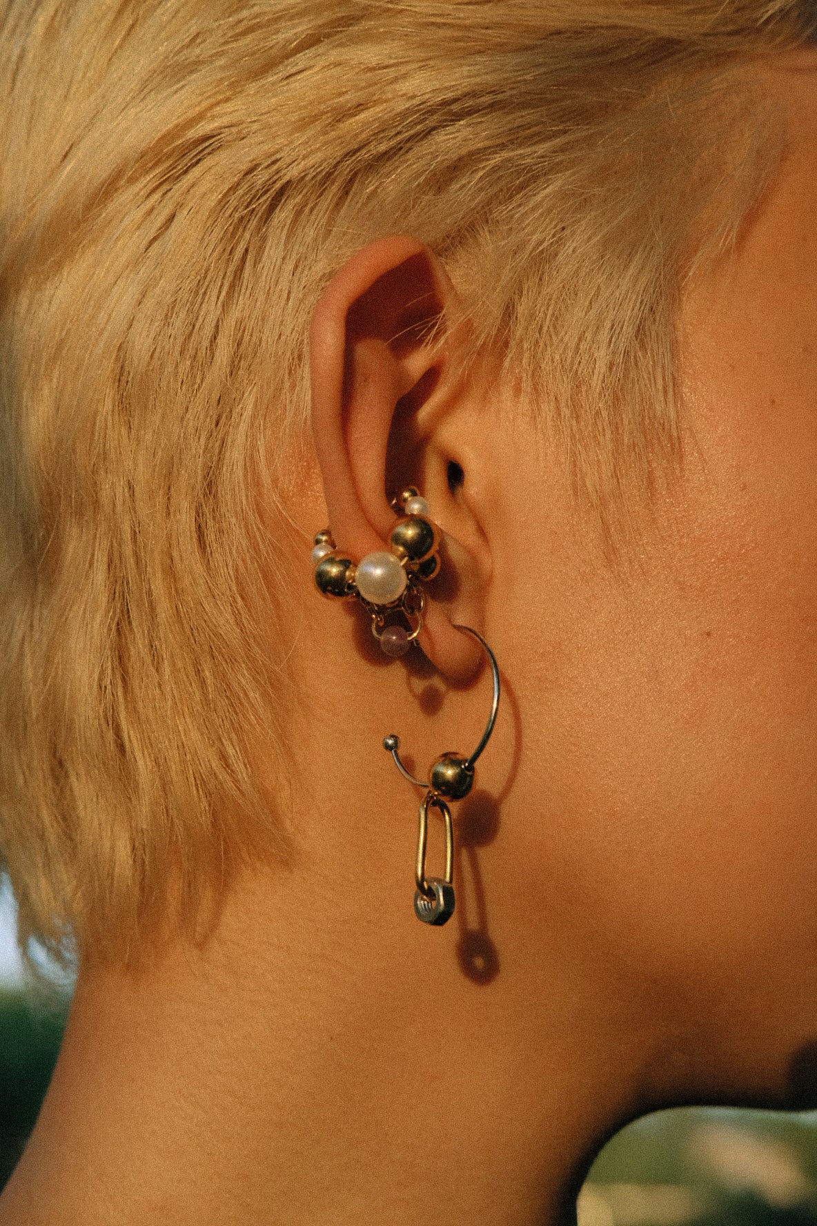 - Accents: Industrial gold-tone safety pin, silver hex nut charm